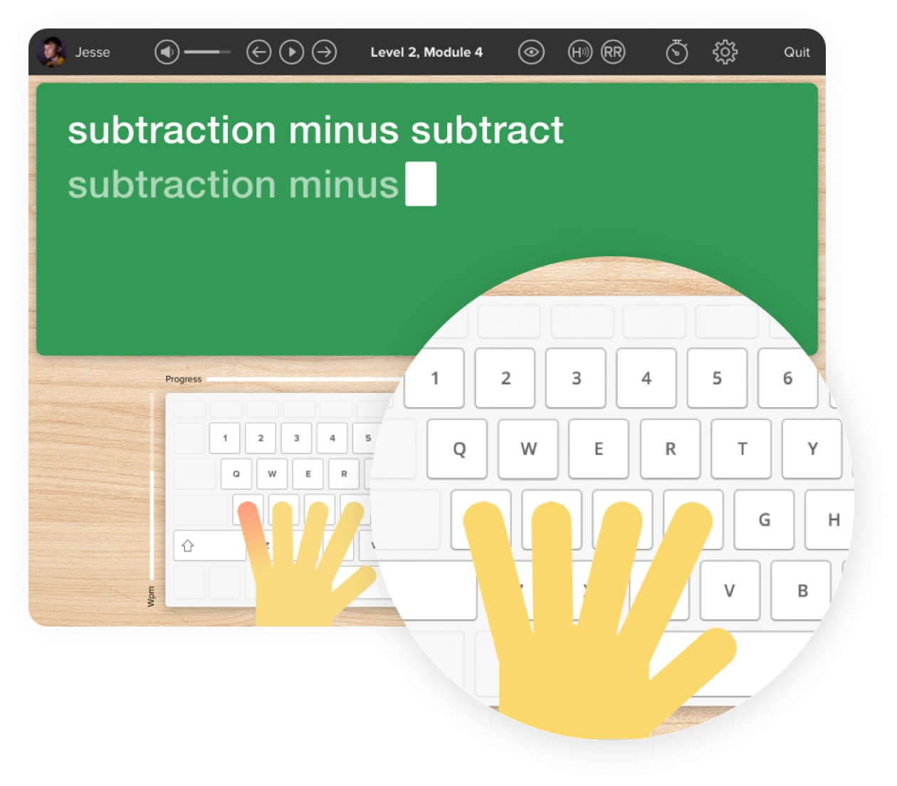 Through the multi-sensory approach, students hear the words using headphones, see the words printed on the screen, and are prompted as to which fingers to press via the on-screen keyboard.