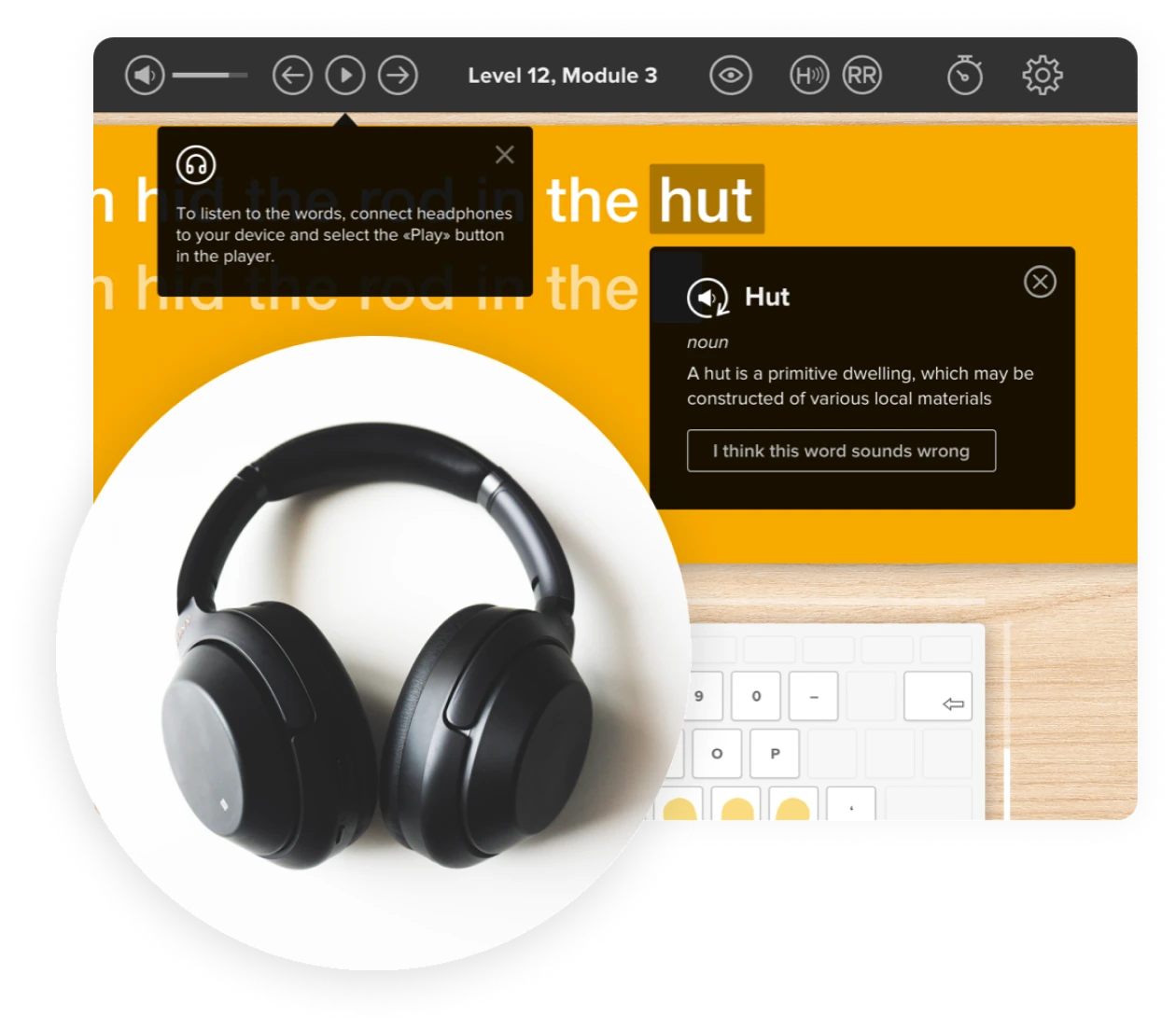 Every 5th module is a dictation module that removes the visual element encouraging the student to listen to the words and then type out what they hear. This reinforces the words introduced in the previous 4 modules. It also develops spelling by testing sound-letter mapping skills.