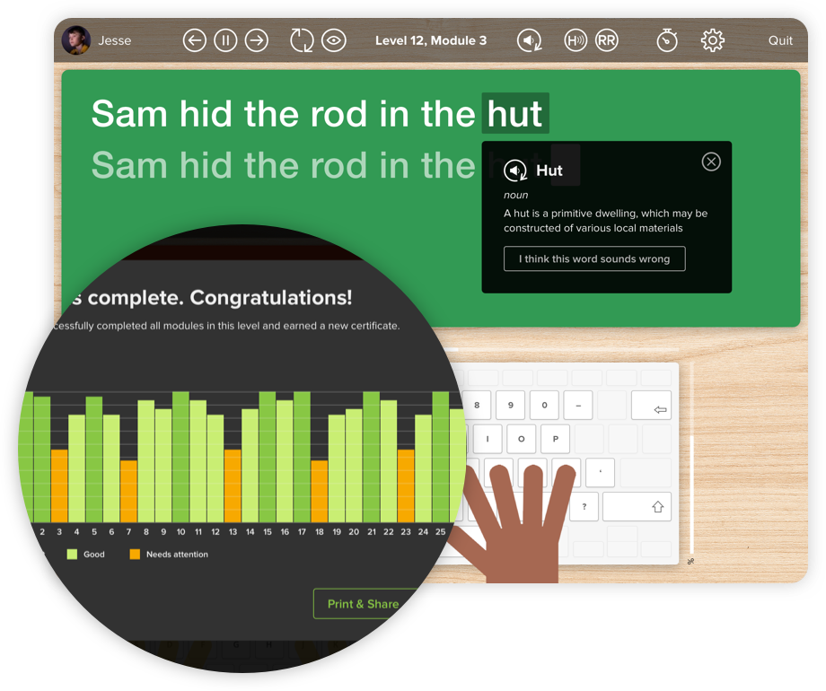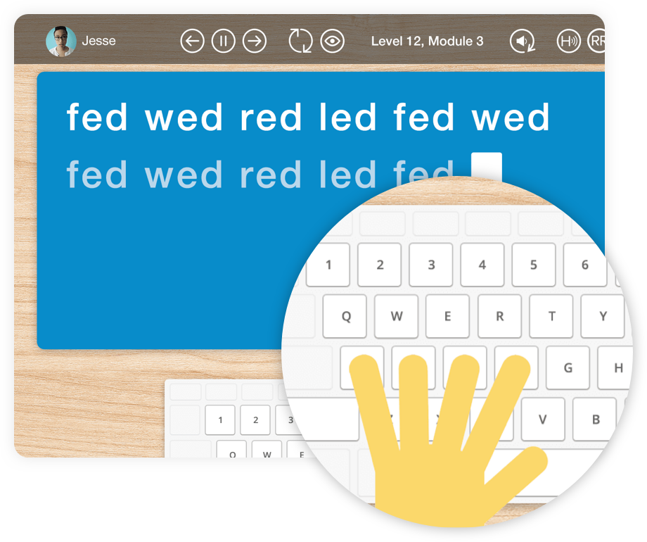 In the second level, the student is introduced to words grouped by onset, vowel-blend and final consonant. For example - fed, wed, led. This teaches phonics in context and at the same time the student is learning how to touch-type. With repetition, these words move from short-term to long-term memory. Every 5th module is a dictation module that removes the visual element encouraging the student to listen to the words and then type out what they hear. This reinforces the words introduced in the previous 4 modules. It also develops spelling by testing sound-letter mapping skills.